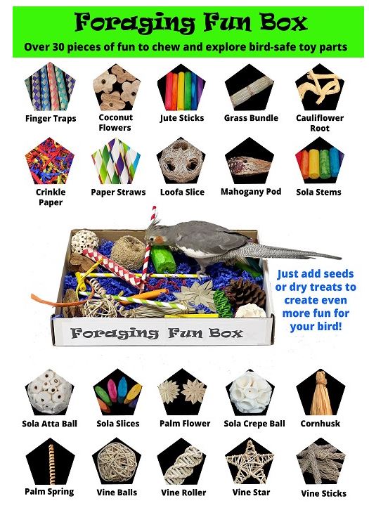 - FOR MEDIUM BIRDS – The Foraging Fun Box bird toy by Super Bird Creations is the perfect size for Ringnecks, Medium Conures, Quakers, Caiques, Pionus, Senegals, and similarly sized pet birds.