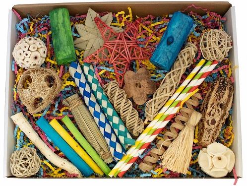 - ENRICHMENT BENEFITS – This “Party in a Box” is designed to satisfy your bird’s innate desire to chew and forage and will thrill your bird with all the fun shapes, colors, and textures to explore. Just sprinkle in dry treats to create an invaluable foraging experience.